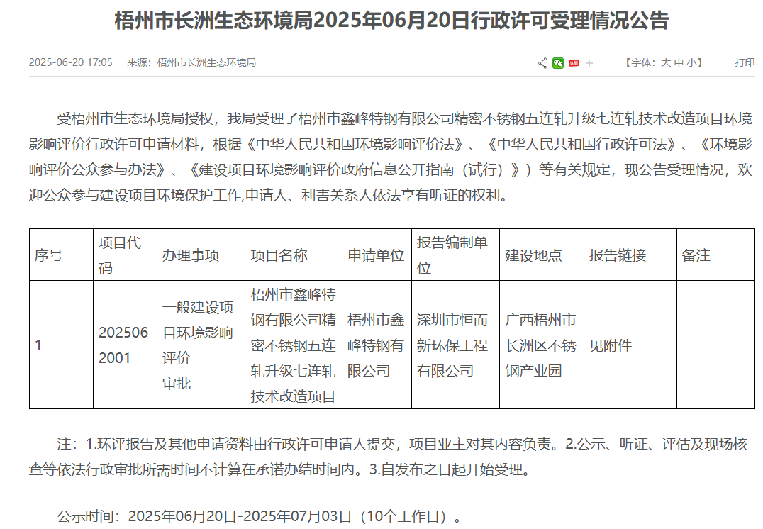 2025年6月20日,梧州市長(zhǎng)洲生態(tài)環(huán)境局受理梧州市鑫峰特鋼有限公司精密不銹鋼五連軋升級(jí)七連軋技術(shù)改造項(xiàng)目環(huán)境影響評(píng)價(jià)行政許可申請(qǐng)材料并對(duì)外進(jìn)行公示,公示時(shí)間:2025年06月20日-2025年07月03日(10個(gè)工作日)。