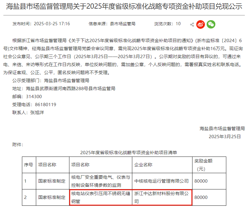 據顯示,浙江中達新材料股份有限公司核電站儀表引壓用不銹鋼無縫鋼管項目獲獎勵金額80000元。